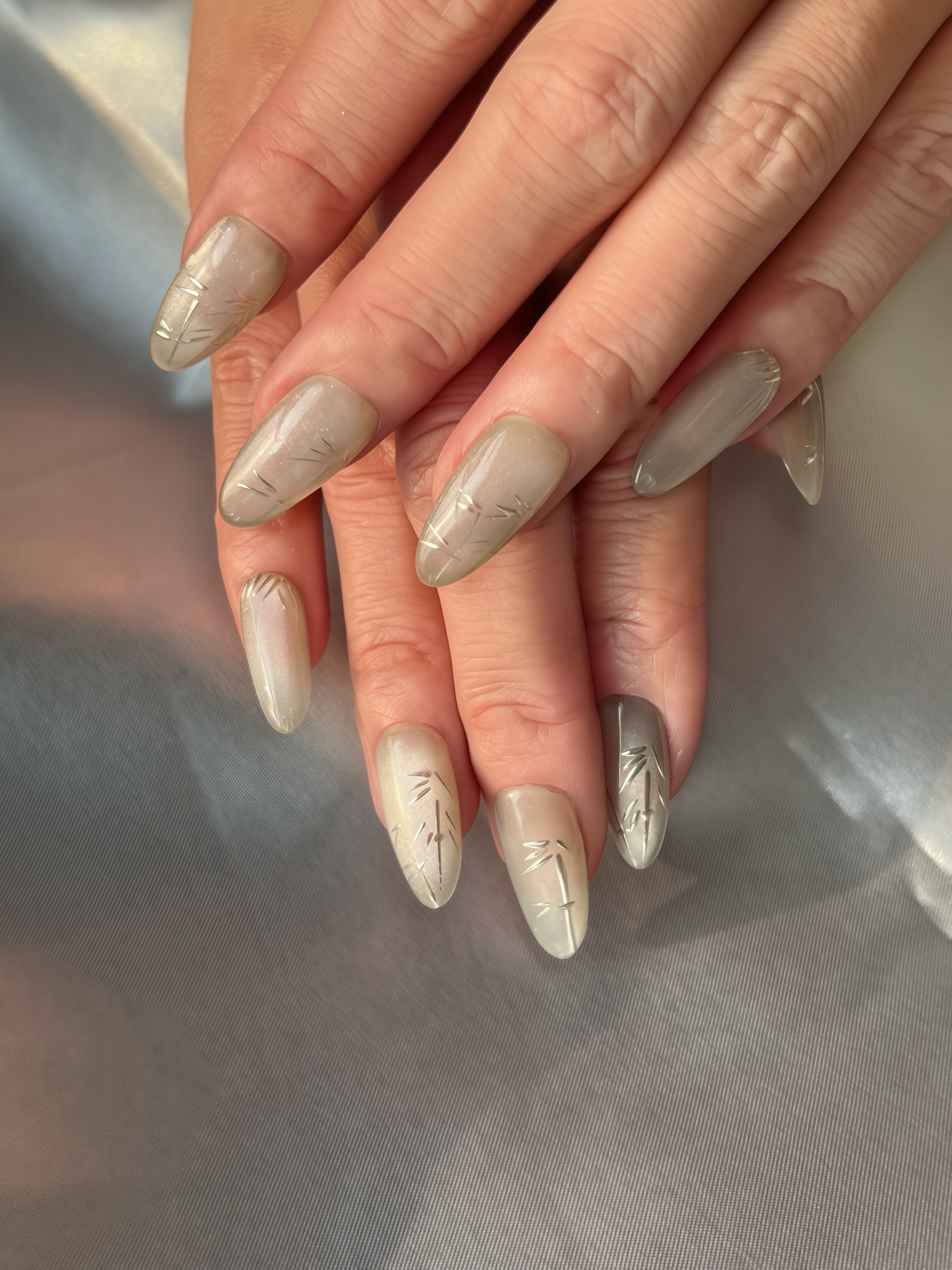 The cool grey-green base carries a soft sheen, and the slim gold bamboo strokes add an architectural touch. It doesn’t try to be delicate—yet it feels effortlessly composed. Wear it on days when you want a clean, sharp, minimal look that still has personality. Perfect for office hours, muted outfits, and anyone who loves a calm kind of elegance.