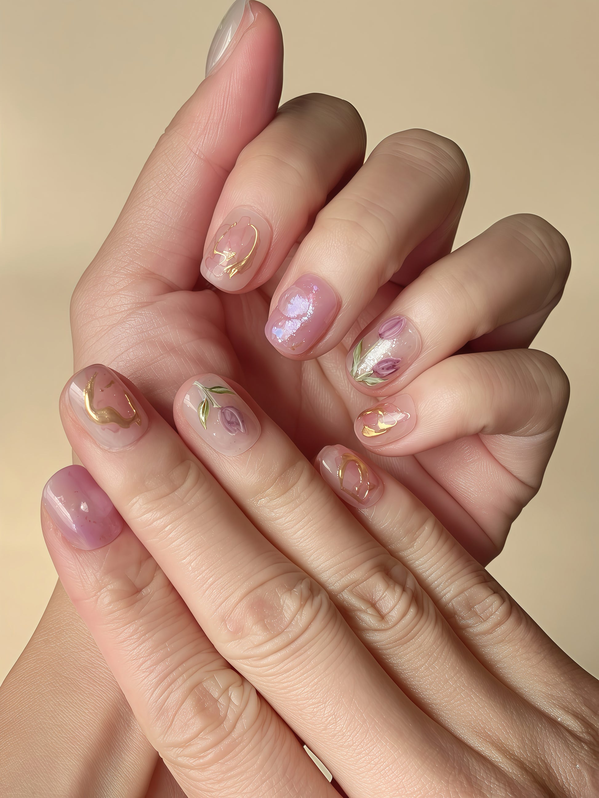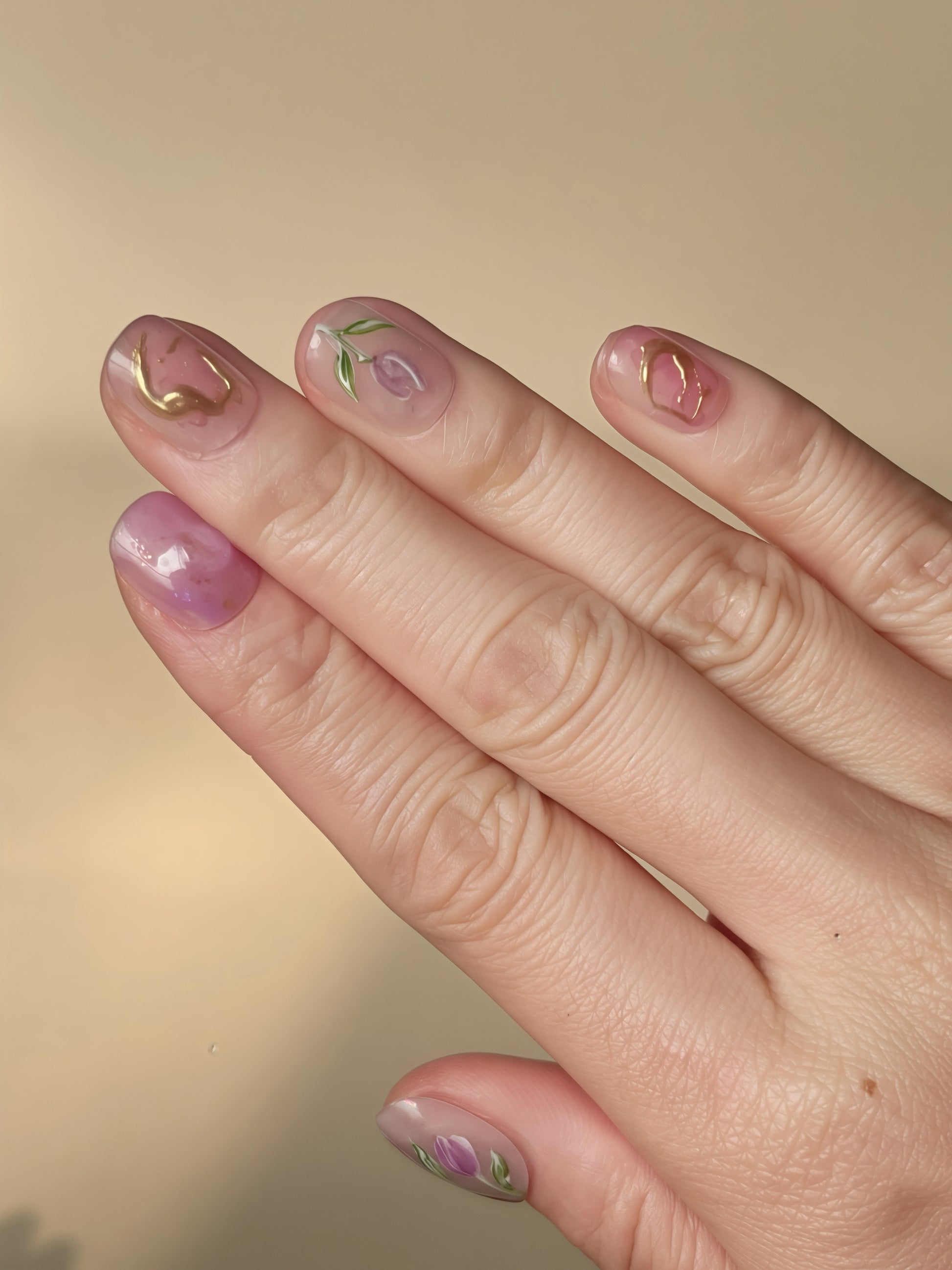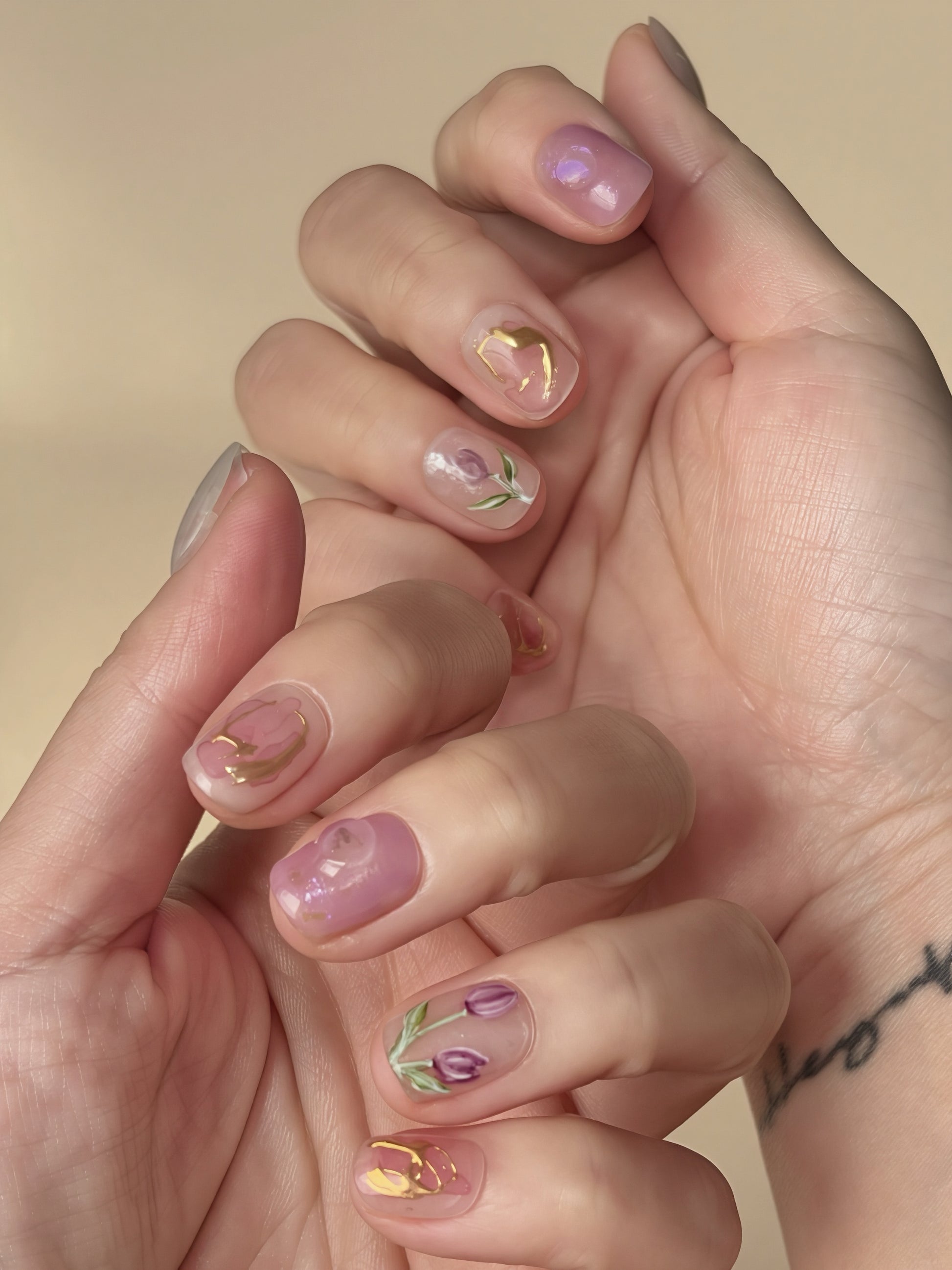 A hand-painted set inspired by a peaceful tulip garden at dawn. Soft purple and pink gradients shimmer with pearlescent glow, while 3D tulip petals with gold outlines and tiny dewdrops bring a touch of magic. Nature quietly paints on your fingertips, making you feel like stepping into a dreamy floral world. Perfect for wearing with tulle dresses, enjoying quiet moments alone, or adding a graceful, enchanted touch to any day.